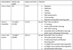 - Cisco U All Access – ~£3,800 per year (or 48 Cisco Learning Credits)